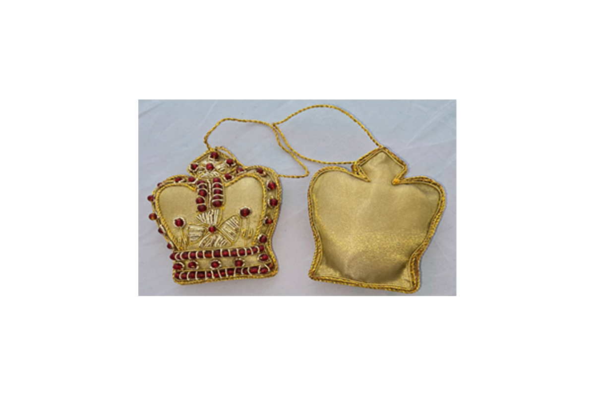 Hand embellished, embroidered, beaded, padded with satin covering coronation crown hanging