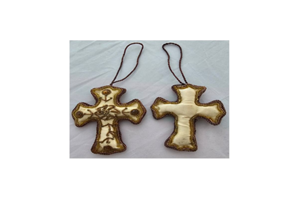 Hand embellished, embroidered, padded with satin covering cross hanging