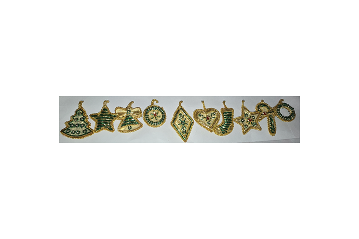 Hand embellished, embroidered, beaded, strip of 10 XMAS tree hangings