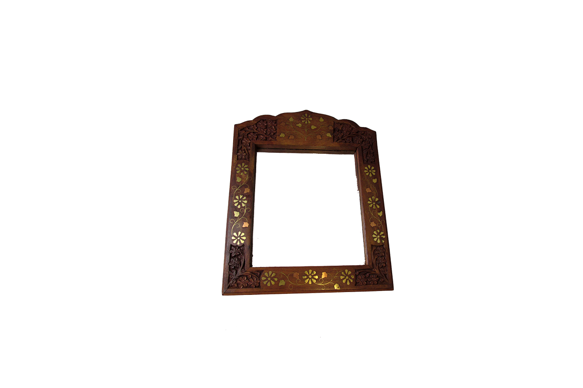 • Solid wood carved mirror frame with brass & copper inset fretwork